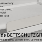 Installare la protezione letto è estremamente semplice: posizionala sul giroletto tra la rete a doghe e il materasso senza viti. La protezione con gli angoli lunghi viene poi posizionata sotto il materasso sulla rete a doghe e, se necessario, può essere posizionata più in alto o in basso sul bordo lungo del letto. Le due staffe di supporto arrotondate a misura di bambino forniscono il supporto necessario in modo rapido e semplice.